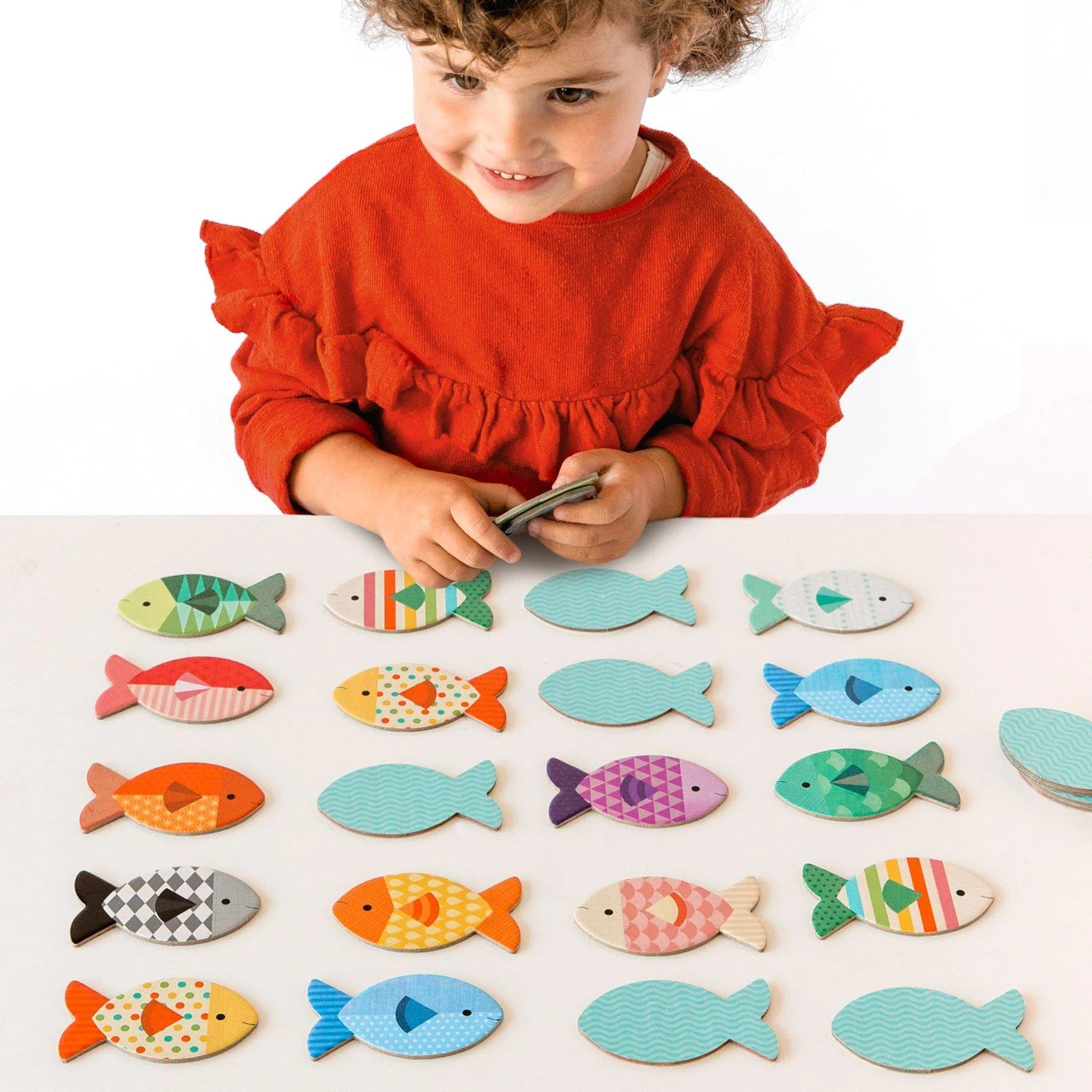 The perfect pre-school matching game. Match 24 cards to make 12 pairs featuring colorful fish with holographic foil effects. These large, fun-shaped pieces are just right for small hands. Complete with an easy open box for quick clean-up.