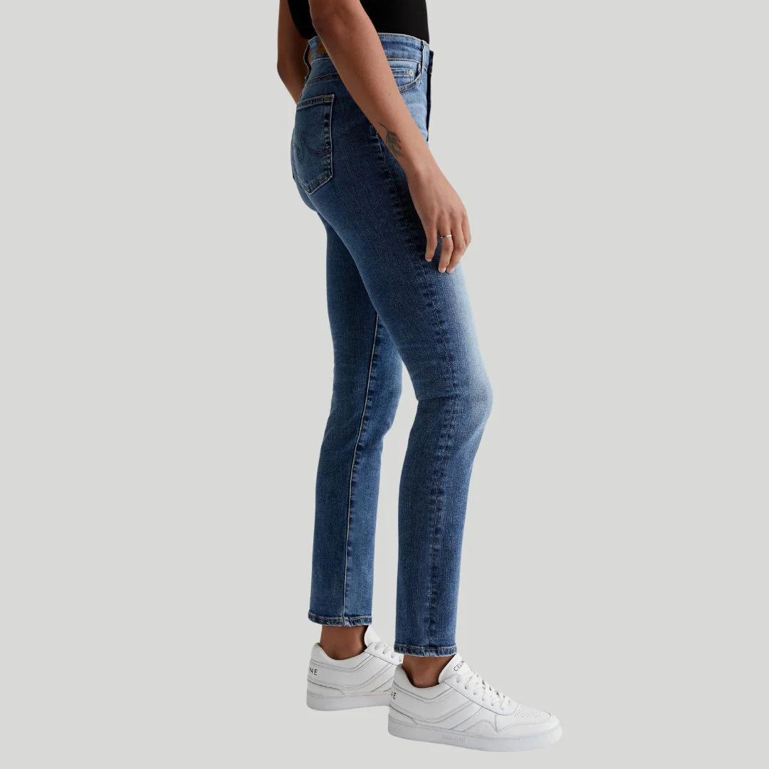 Mari is a mid-rise straight leg jean featuring a medium indigo wash with a 13-year AG-ed™ vintage fade, distressing at the pockets, and slightly worn hems. Mari offers a flattering mid-rise waist and fits easy around the hips, finished with a straight leg and subtle slim leg opening.