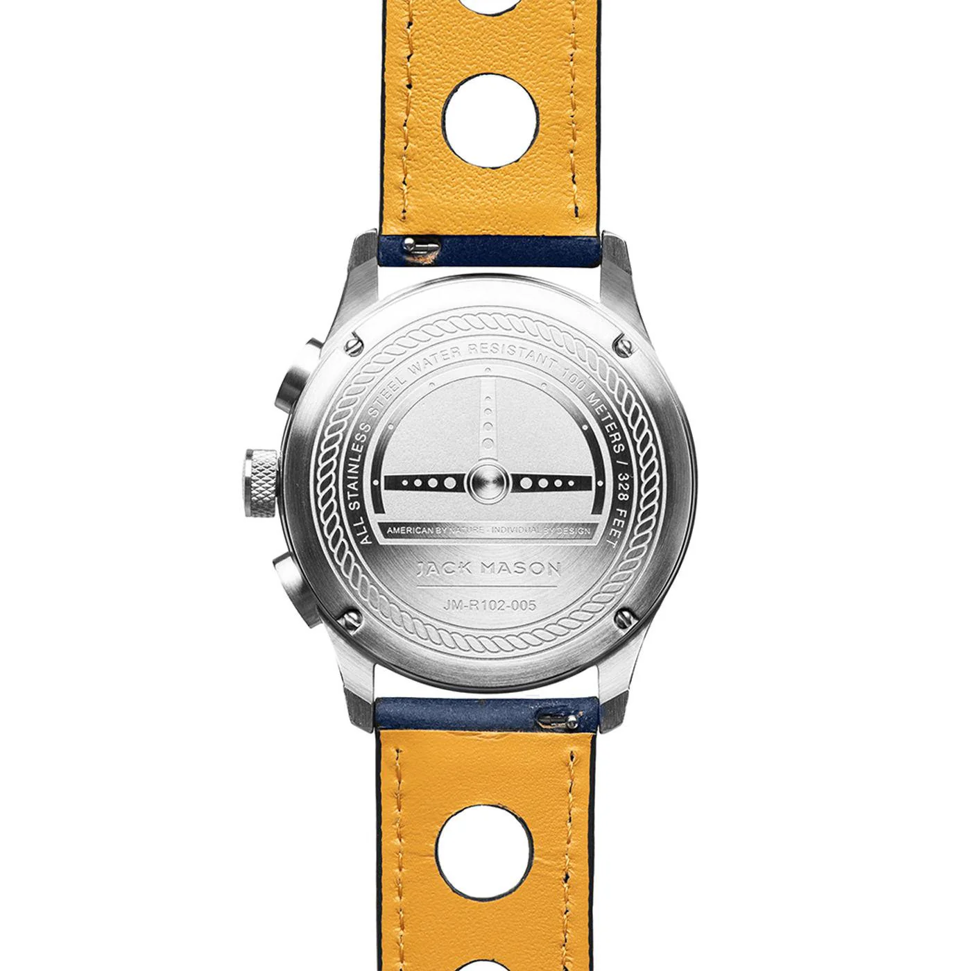 Bold and polished, the Racing Chronograph features a cream dial, stainless steel case and brown Italian leather straps. Modeled after vintage driving gloves, the straps paired with the gauge-inspired Navy tachymetric bezel make the Racing Chronograph 42mm JM-R102-005 the perfect companion for cruising into the weekend.